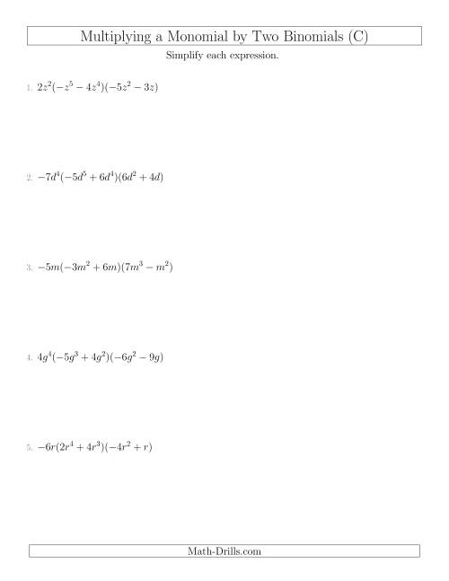 Multiplying Monomials And Binomials Worksheet. This pre algebra monomial and polynomial worksheet will produce ten problems per page. Multiply the monomial with the first term of the binomial.